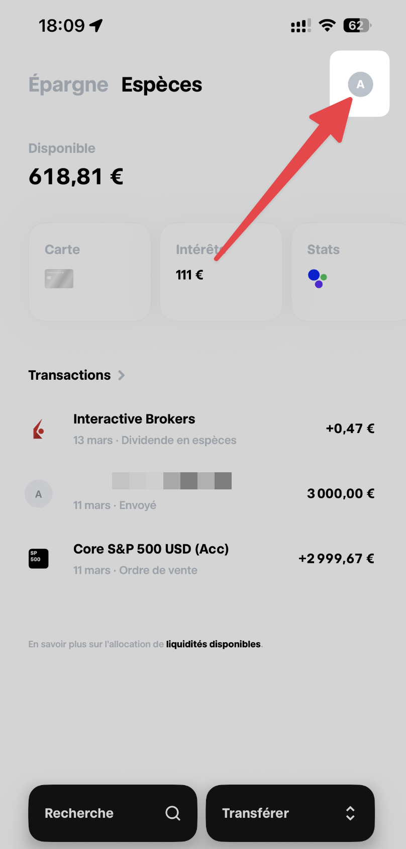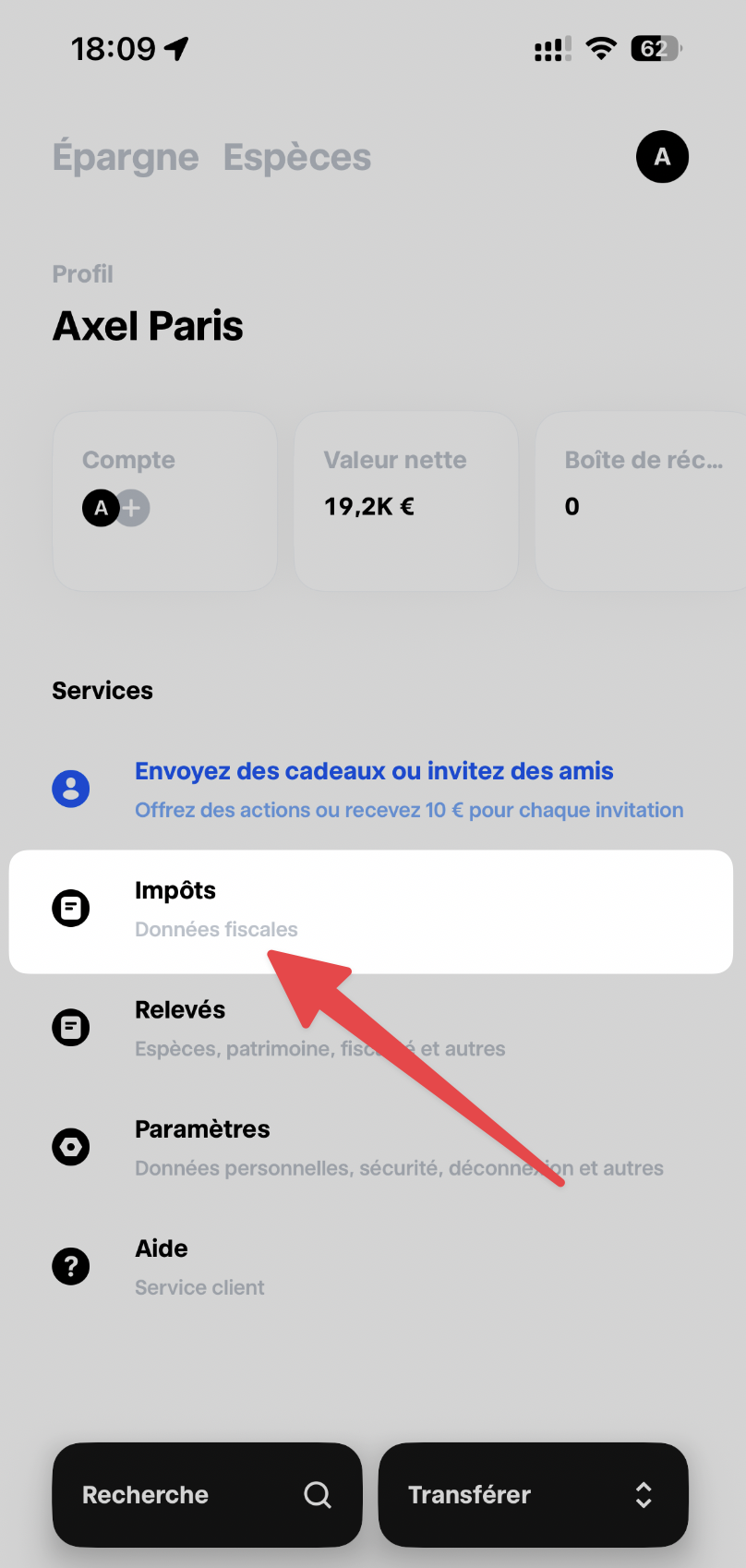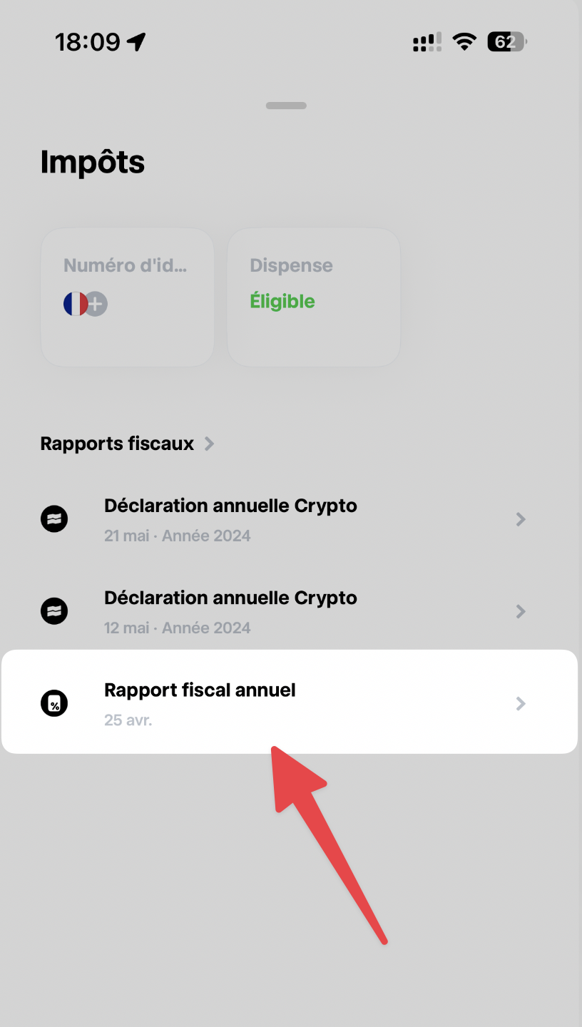 Cliquez sur votre profile (icône en haut à droite) > “Impôts” > “Rapport fiscal annuel”