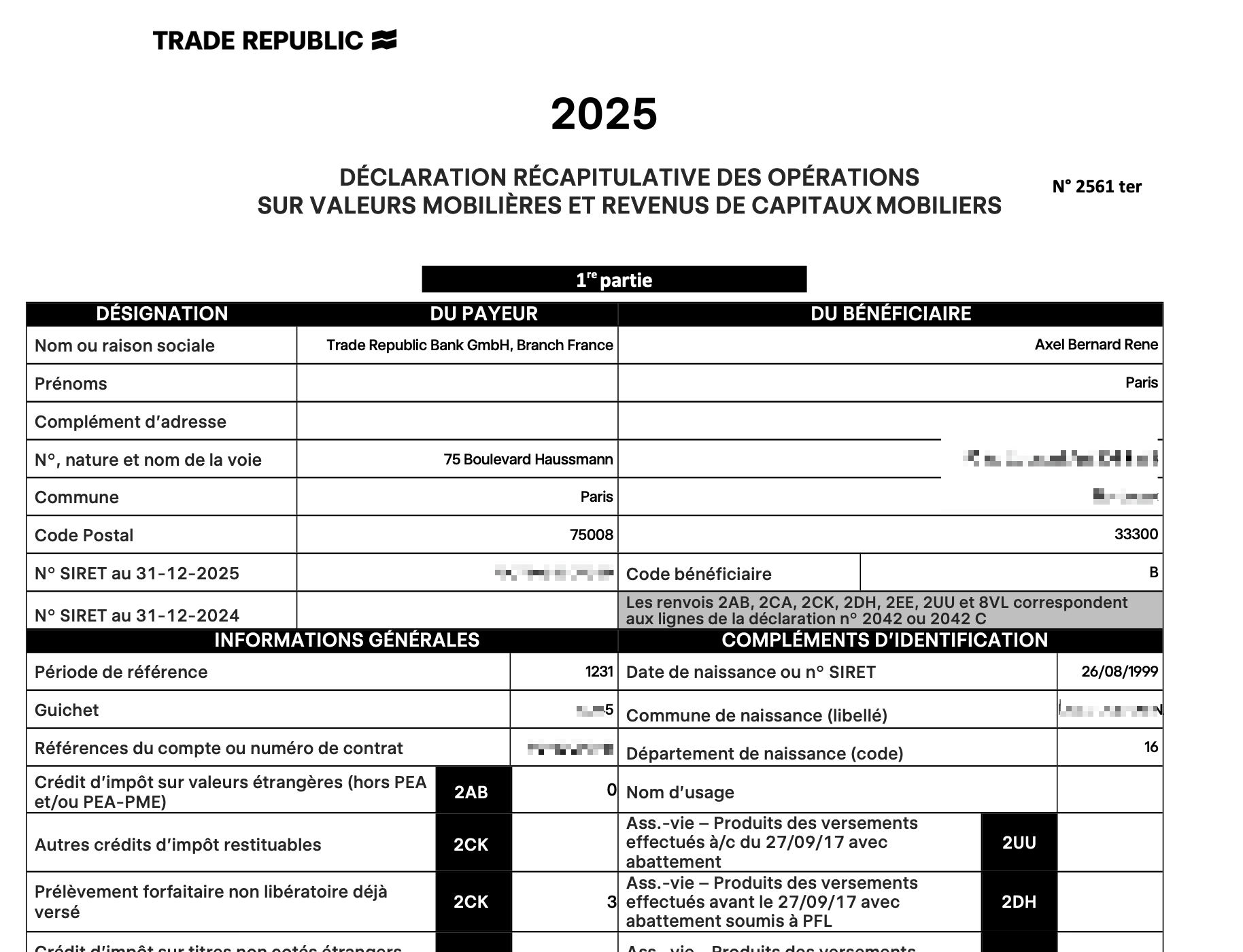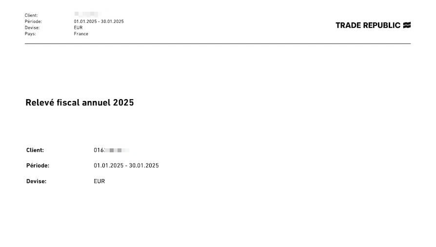 Depuis janvier 2025, Trade Republic à ouvert une succursale en France. Si vous êtes client de cette entité-ci, ils vont télé-déclarer vos données directement aux impôts et vous fournir un autre type de document : un IFU (imprimé fiscal unique).
