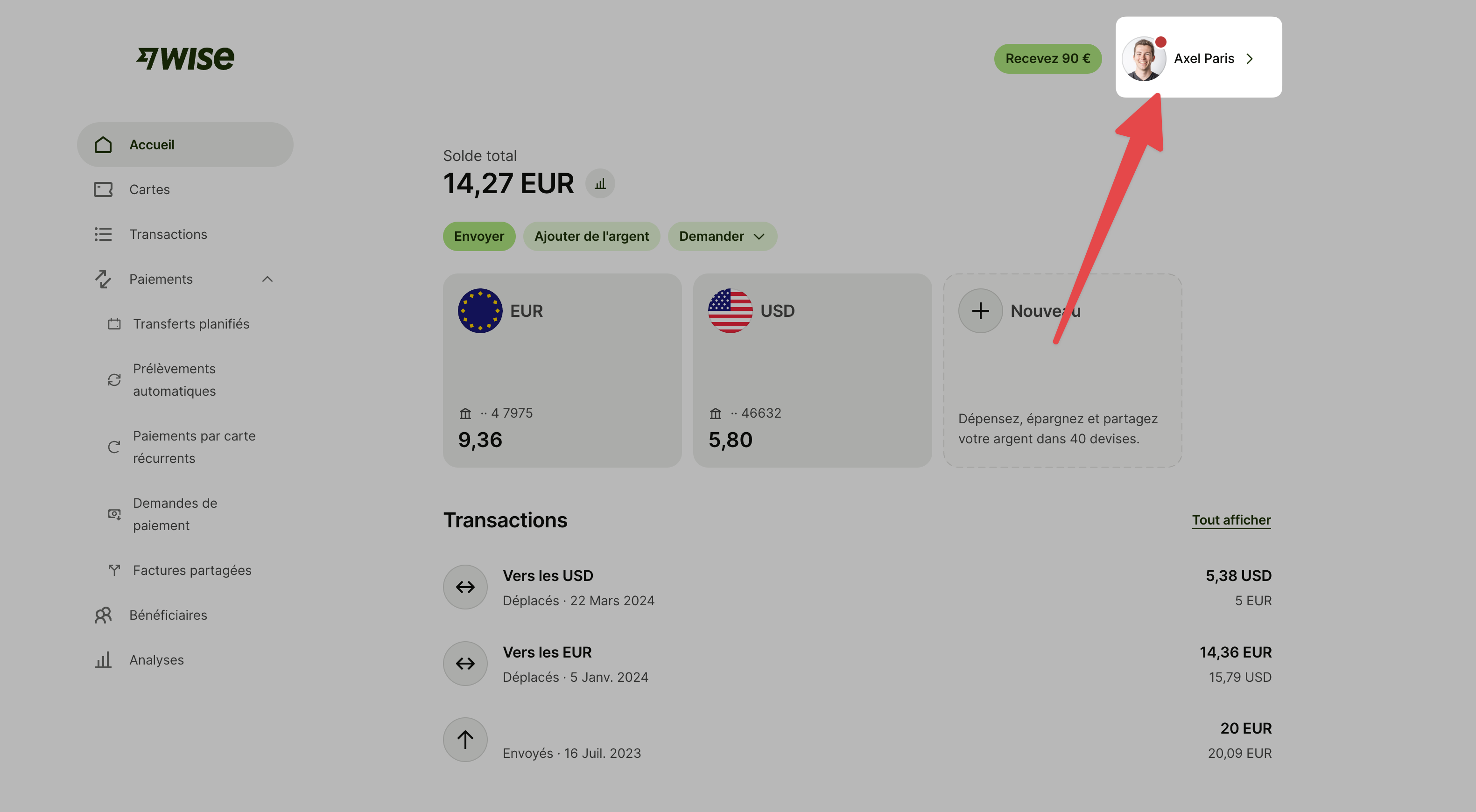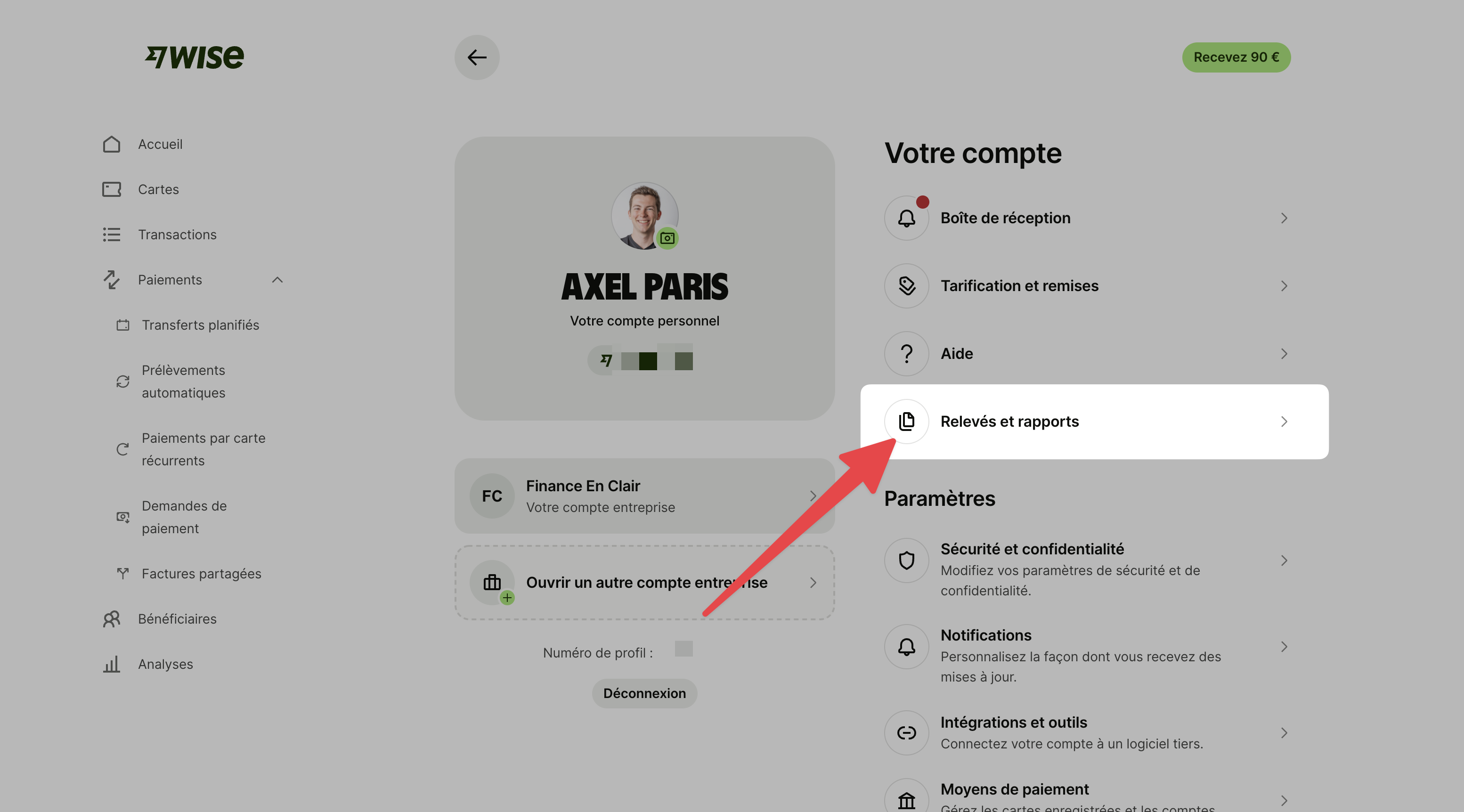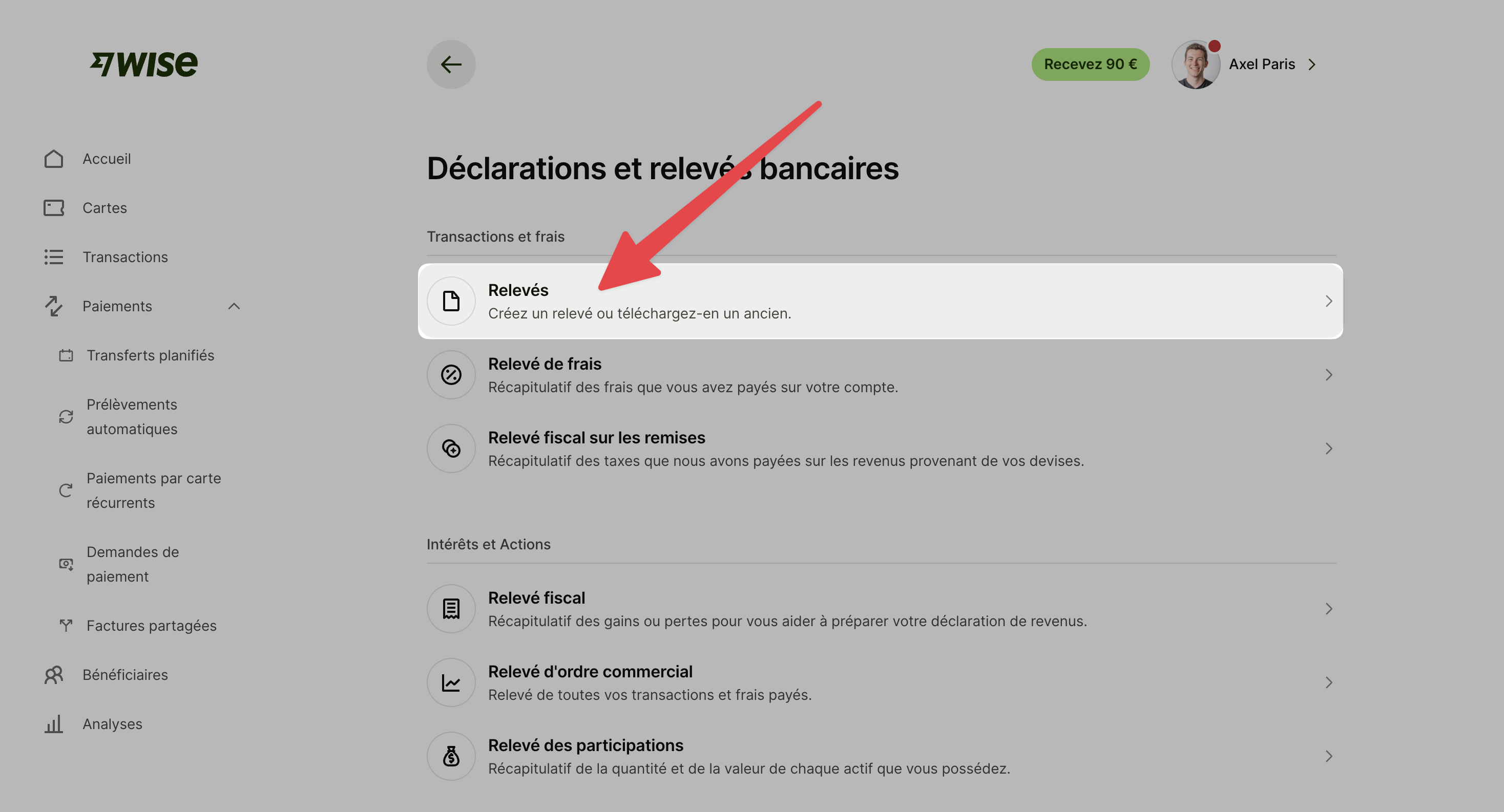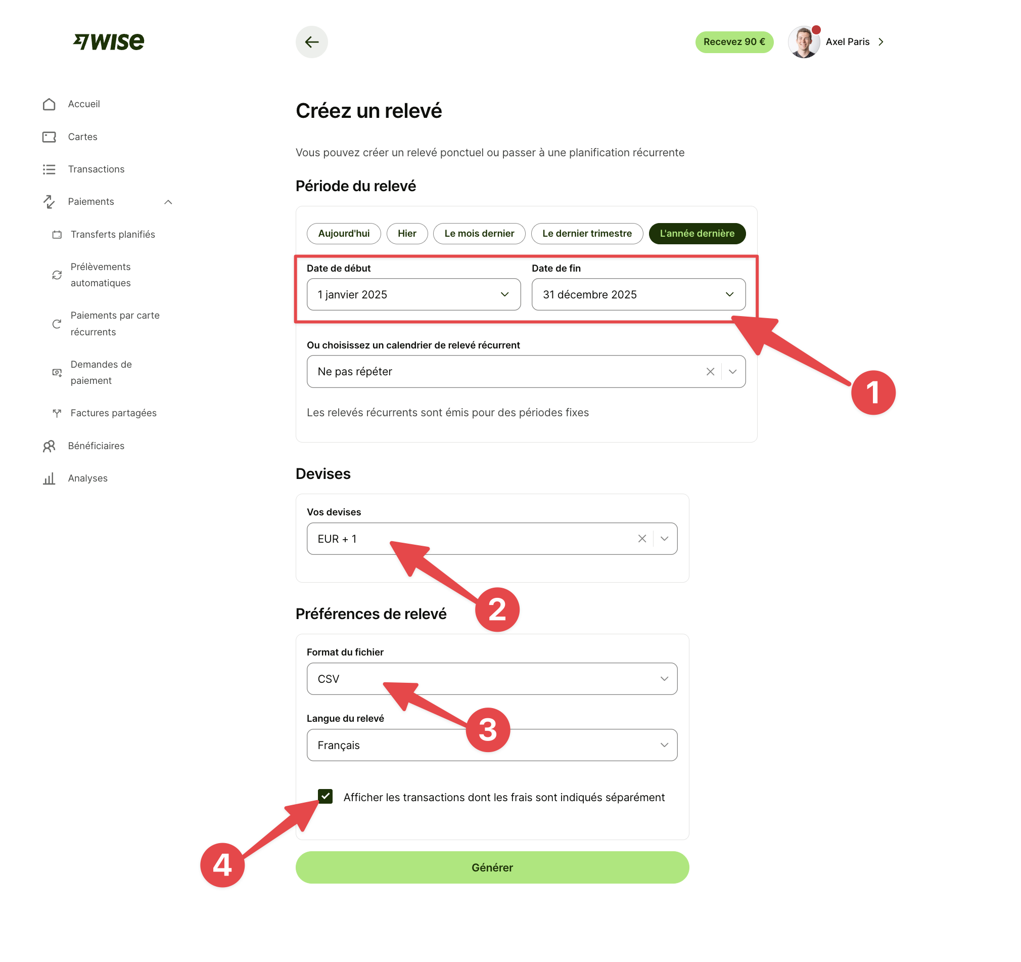 Rendez-vous sur la page "Créer un relevé" depuis ce lien : https://wise.com/balances/statements/balance-statement/create?referrer=%2Fyour-account (ou suivez les étapes avec ces captures d'écran)